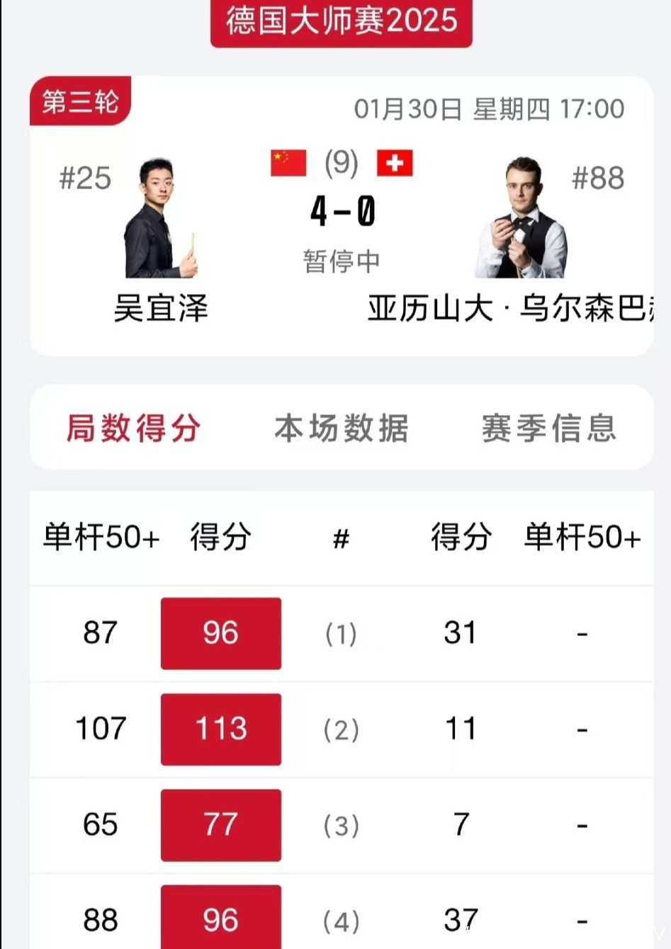 第三局,吴宜泽又打出单杆50分,52-12赢下,比分上风进一步扩大到4-0,并粗拙取得四个赛点。