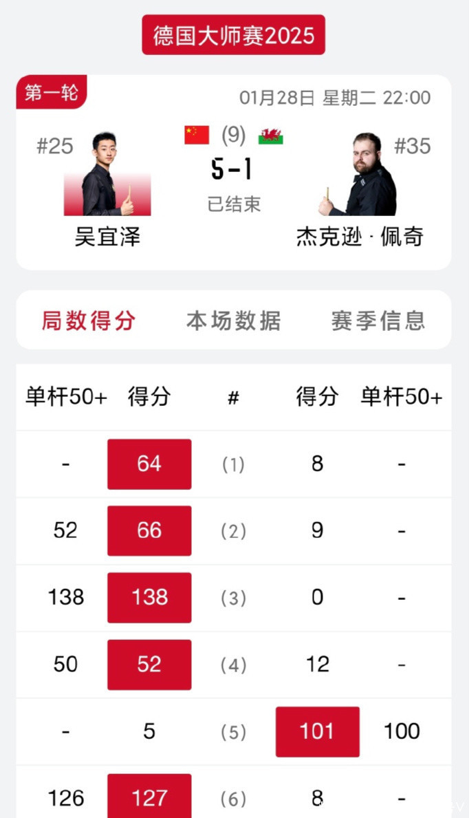 第五局,简短的局间休息归来之后,莫得退路的“小猪”佩奇张开落拓反击,他轰出单杆100分,101-5救援一个赛点,比分追成1-4。第六局,吴宜泽再也莫得给敌手契机,他又轰出单杆126分,127-8锁定胜局,总比分5-1将“小猪”佩奇横扫出局,强势开启本次德国人人赛的征途。