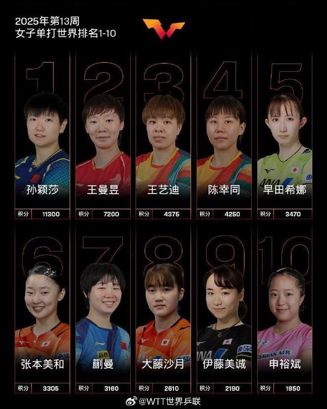 外洋乒联2025年第13周寰宇排行还是更新,林诗栋、王楚钦连接位列男单前二,孙颖莎、王曼昱、王艺迪、陈幸同位列女单前四。